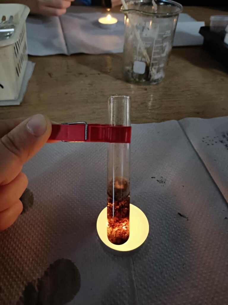Do CuCl2 dodaliśmy zwinięty kawałek aluminium – powstała miedź jako rudawawa substancja i sól AlCl3 – wkładając rozpalone łuczywo, pojawiał się lekko niebieskawo-zielony płomień, charakterystyczny dla miedzi